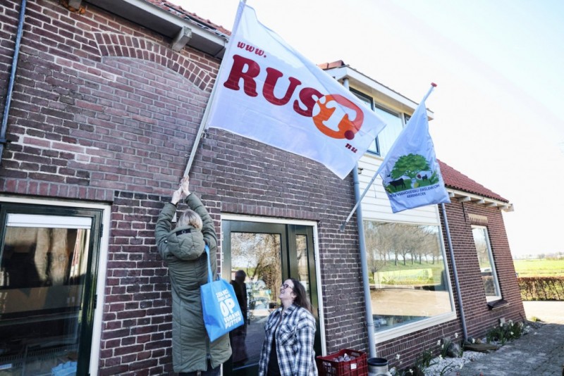 José Eikelenboom kijkt toe hoe de vlag wordt opgehangen die meldt dat er een Rustpunt is bij de melkveehouderij van haar en haar man. © Peter de Jong Fotografie