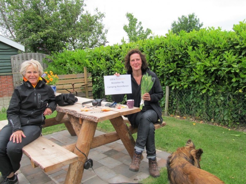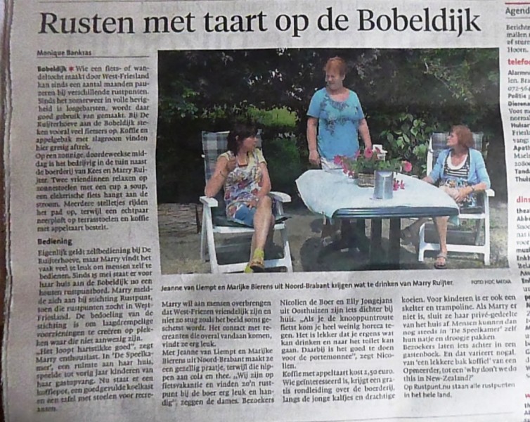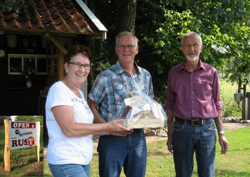 In 2010 werd het project met succes volbracht en het echtpaar kreeg van het Historisch Genootschap Beemster de jaarlijkse Complimentprijs uitgereikt. Het bord prijkt aan de muur. ,,Natuurlijk genieten wij zelf van de boomgaard'', zegt Jaap. ,,Maar we vinden het leuk als andere mensen er ook naar komen kijken.'' Ria: ,,Ik kwam eerst met het idee een overnachtingsplek te bieden aan fietsers voor Stichting Vrienden op de Fiets. Maar dat ging Jaap een streepje te ver. We hebben in huis maar één badkamer en het leek hem niet prettig 's nachts vreemde mensen op de gang tegen te komen. In de krant lazen we toen dat Water, Land & Dijken rustpunten zocht. Dat leek ons wel erg leuk.''