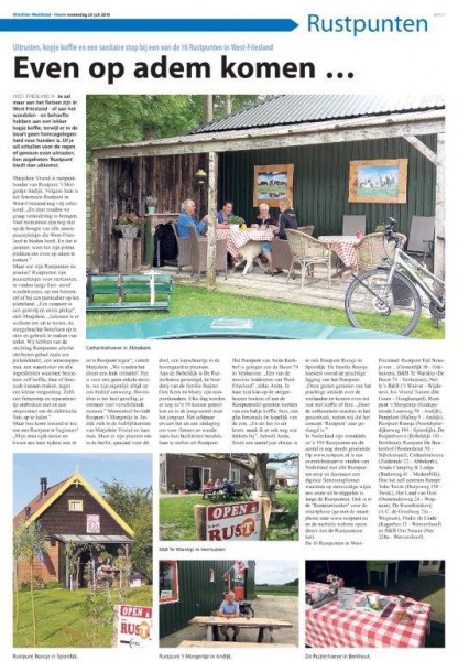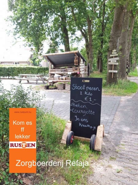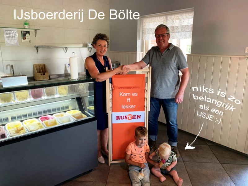 José Eikelenboom uit Abbenbroek zag op vakantie in eigen land de oplossing voor dit soort ‘problemen’: een Rustpunt waar mensen even kunnen pauzeren voor een sanitaire stop of om wat drinken, hun waterflesje te vullen, de lekke band te plakken of een streekproduct te kopen. Samen met Angelien Poot van het winkeltje De IJsboerin in Rockanje kreeg ze, met hulp van de stichting Marketing OP Voorne-Putten, voor elkaar dat zulke Rustpunten er nu zijn. Eentje daarvan is bij haarzelf, in de melkveehouderij van José en haar man Bart aan de Katerwaalsedijk 13 in Abbenbroek