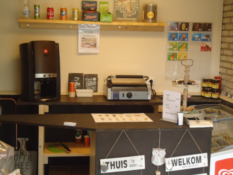 Het assortiment van het winkeltje is fors uitgebreid. Behalve koffie, thee, frisdrank en oud Hollands snoepgoed verkopen we ook tekstbordjes en kleine teksthangertjes. Leuk om cadeau te geven.