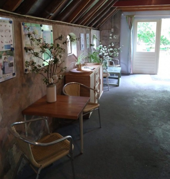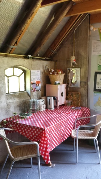 In de voormalige boerderij hebben we een hoekje ingericht waar gasten zelf koffie of thee kunnen zetten of frisdrank nemen. Ook verkopen we Drents ijs als de receptie open is.