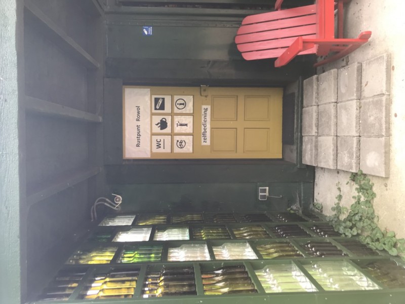 Naast biologische koffie, thee, fruitdrank, limonade, soep, (in plastic verpakte) reepjes en andere versnaperingen is ons rustpunt voorzien van een buitentoilet en een oplaadpunt voor e-bikes.
