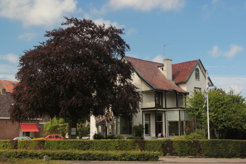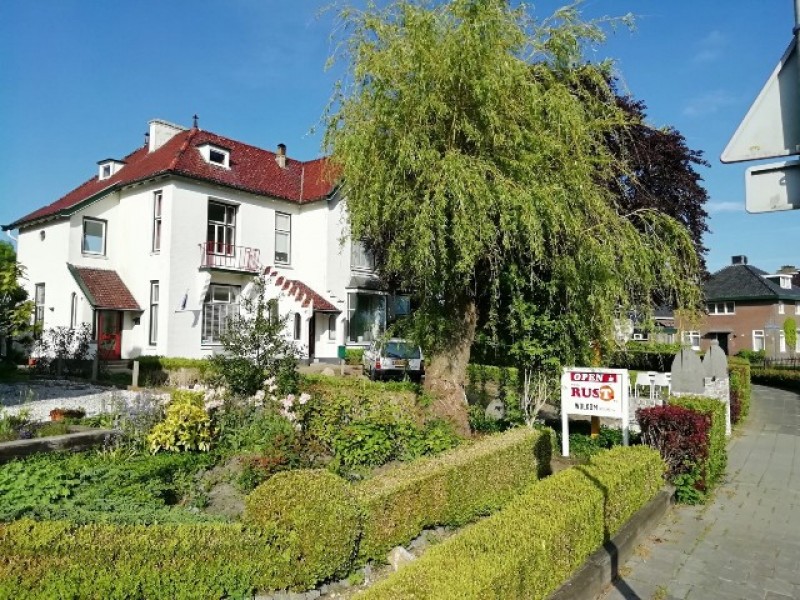 Theeschenkerij-tuinVilla Nij Bonga is een imponerend pand, gebouwd in 1907 door notaris Poelstra, met veel stijlelementen uit de Art Nouveau. Op de palen bij de inrit staat nog altijd in vergulde letters de naam ‘’Nij Bonga’’. Het pand is na het vertrek van de notaris tot 2012 in gebruik geweest als woning en huisartsenpraktijk. In 2015 is het pand door ons, Henk en Jantina van Huizen, gekocht en hebben wij de voormalige praktijkruimte verbouwd tot logies. De gasten van Nij Bonga kunnen gebruik maken van de linkerzijde van het pand, te bereiken via de eigen voordeur. Wij wonen aan de andere zijde met onze twee zoons.