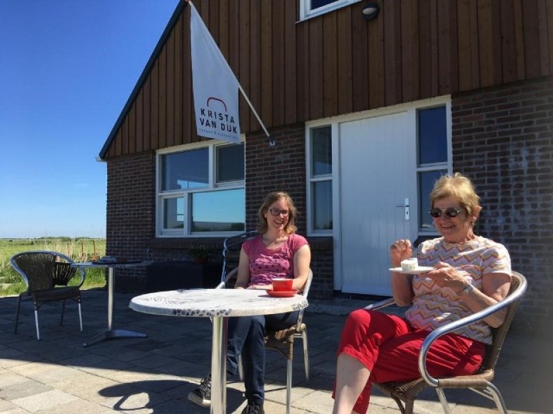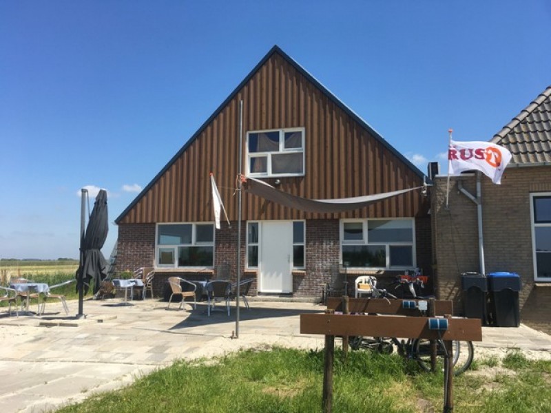 Bij ons kun je heerlijk buiten zitten en heb je een weids uitzicht over de landerijen. We bieden koffie/thee/limonade/ijs en taart aan. Bij ons kun je ook gebruik maken van het toilet en zijn er 4 oplaadpunten voor de elektrische fiets aanwezig.