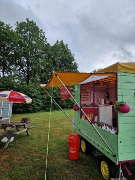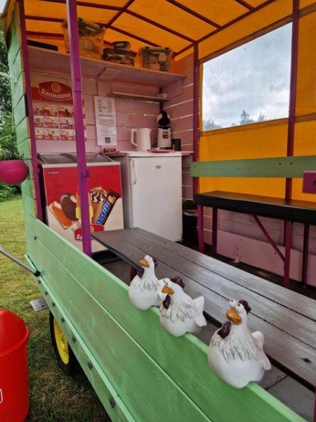 Via een bruggetje over de sloot bereik je onze omgebouwde pony huifkar, die van alles te bieden heeft. Koffie/thee, blikjes drinken, ranja, verschillende soorten koek en niet te vergeten heerlijk ijs!