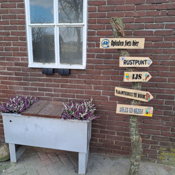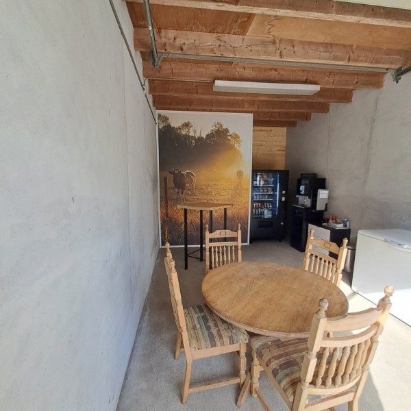 Een fijn, overdekt rustpunt op het erf van ons melkveebedrijf, met toilet en lekkernijen zoals (luxe) koffie, thee, frisdrank, koek, ijs, snoep en chips…Oja, je kan er ook nog eens 4 fietsen/accu’s tegelijk opladen!