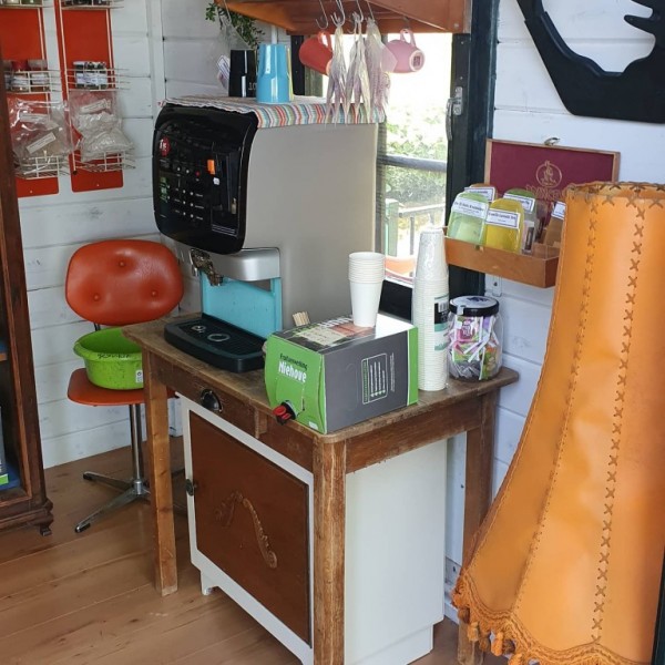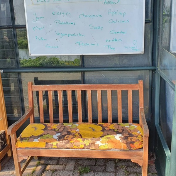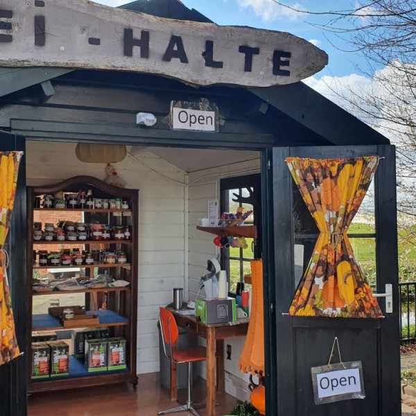 Aan het fietsen of wandelen aan het Achterdiep Noordzijde in Sappemeer? Neem dan een kijkje bij onze nieuwe Rustpunt  De Ei Halte met een MiniBieb om even een boekje door te bladeren en/of mee te nemen (of te brengen, natuurlijk), met een bankje, water, koffie, thee tegen kleine vergoeding, een ijsje in de zomer en niet te vergeten, met een winkeltje met kakelverse eieren, kruiden , zelfgemaakt jammetjes, chocopastas, pindakaas , sausjes en zoveel meer wat ook allemaal zelf gemaakt en gekweekt is. De uitstraling van het winkeltje is al een bezienswaardigheid op zich: ‘vintage’ noem je dat – jaren zeventig, ‘foute’ kleuren, lampen die zo lelijk zijn dat ze weer mooi worden.