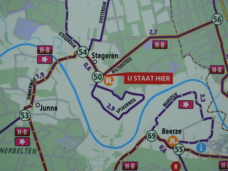 42,4 km. Rustpunt ’n Toorn vindt u bij knooppunt 50. Het “Verzetsmonument” komt u tegen als u het rondje Stegeren fietst.