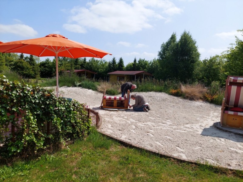 Een heerlijk terrasje met parasols, bij het sanitair gebouw met de mogelijkheid voor een kopje koffie of thee, ranja en een lekkere koek.