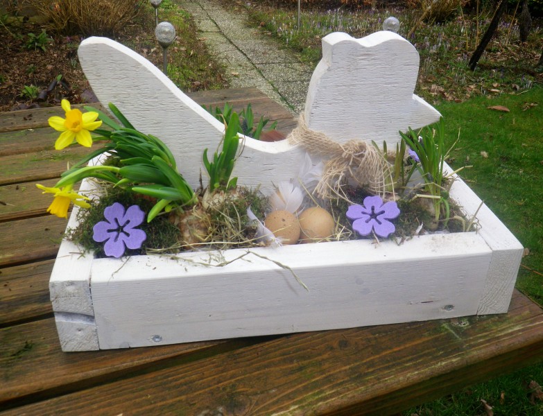 In onze natuur tuin dragen we laarzen of nep croques. Dus hebben we de tien oude ongebruikte houten klompen uit de schuur een nieuw leven gegeven.