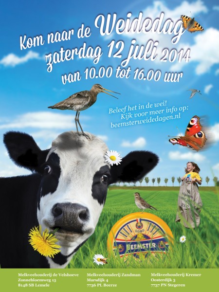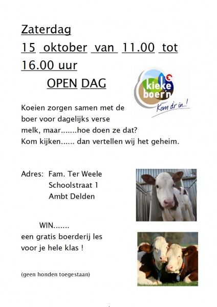 Tijdens onze open dag kunt u koeschilderen in het weiland. Ook mag u zelf boter maken, koemaskers knutselen, overall hangen, koemelken, zijn er oud-hollandse spelletjes, is er een veearts aanwezig die u van alles kan vertellen over dierwelzijn. Ook worden er rondleidingen gegeven door de boer en boerin. en nog veel meer!! Daarnaast zijn er kaasmeisjes die kaas uitdelen en een lekker ben en jerry ijsje mag ook niet ontbreken!!