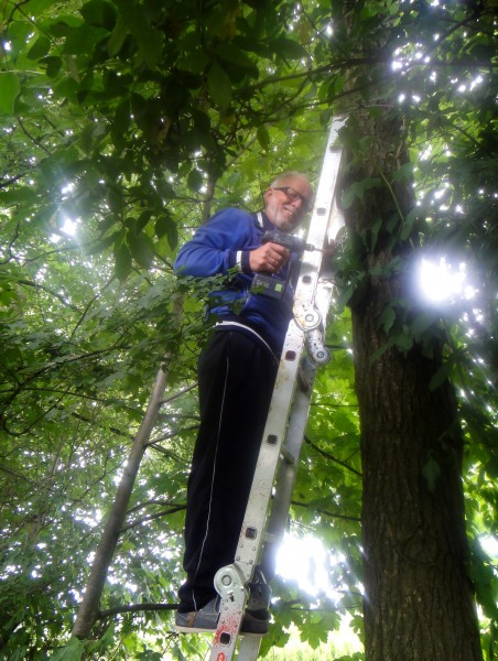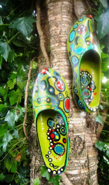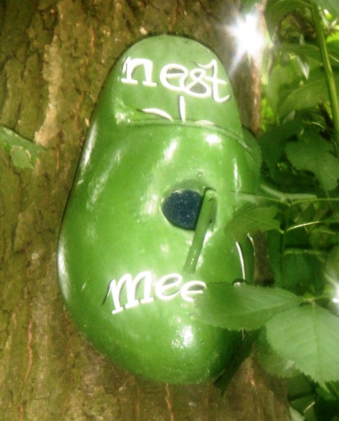 De grootste, maat 46, zijn ideale mezenkastjes als je loopt op het houtsnipperpad naar het lommerrijke Rustpunt picknickplek in het bosje. Dan zijn er nog in maat 44 de groene fantasieklompen, die ahw. de boom in lopen als tipgevers: "kijk ook omhoog!" ...